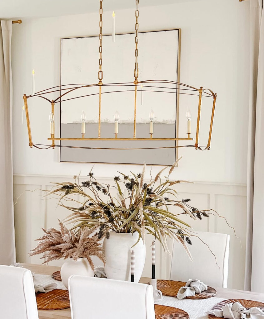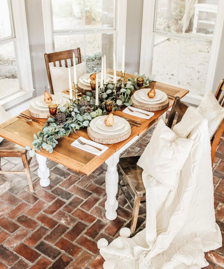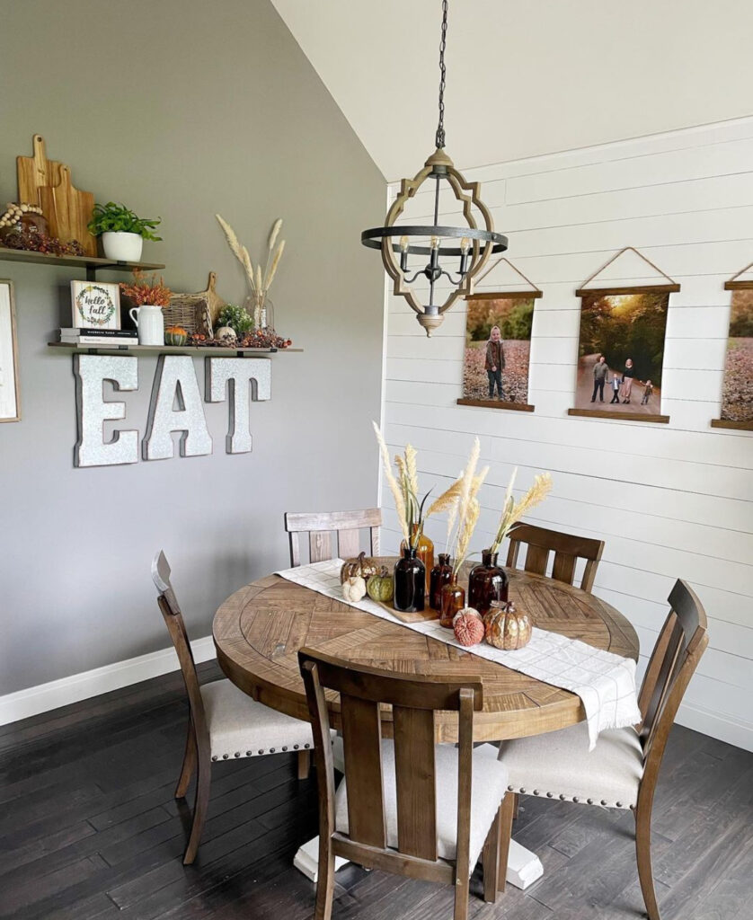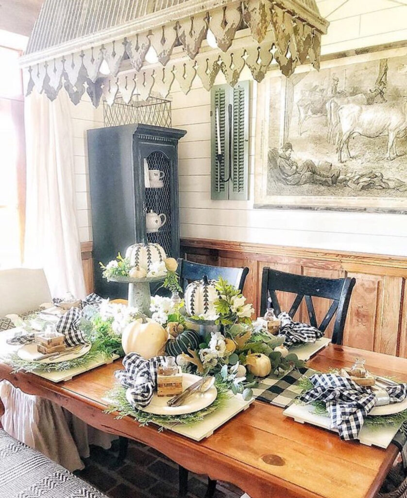 Black-and-white checks, creamy pumpkins, and loads of greenery give this a charming market-day vibe. It’s sweet, welcoming, and prime inspo for dining room decorations without going overboard.