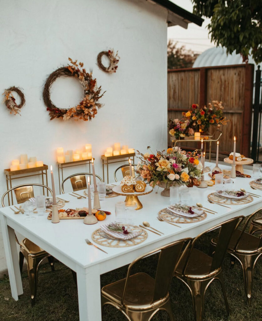 An outdoor table lit by towers of candles and surrounded by metallic chairs? Yes please. The flower-heavy centerpiece and dessert pedestals make it feel like a mini fete—prime fall party table decor territory.