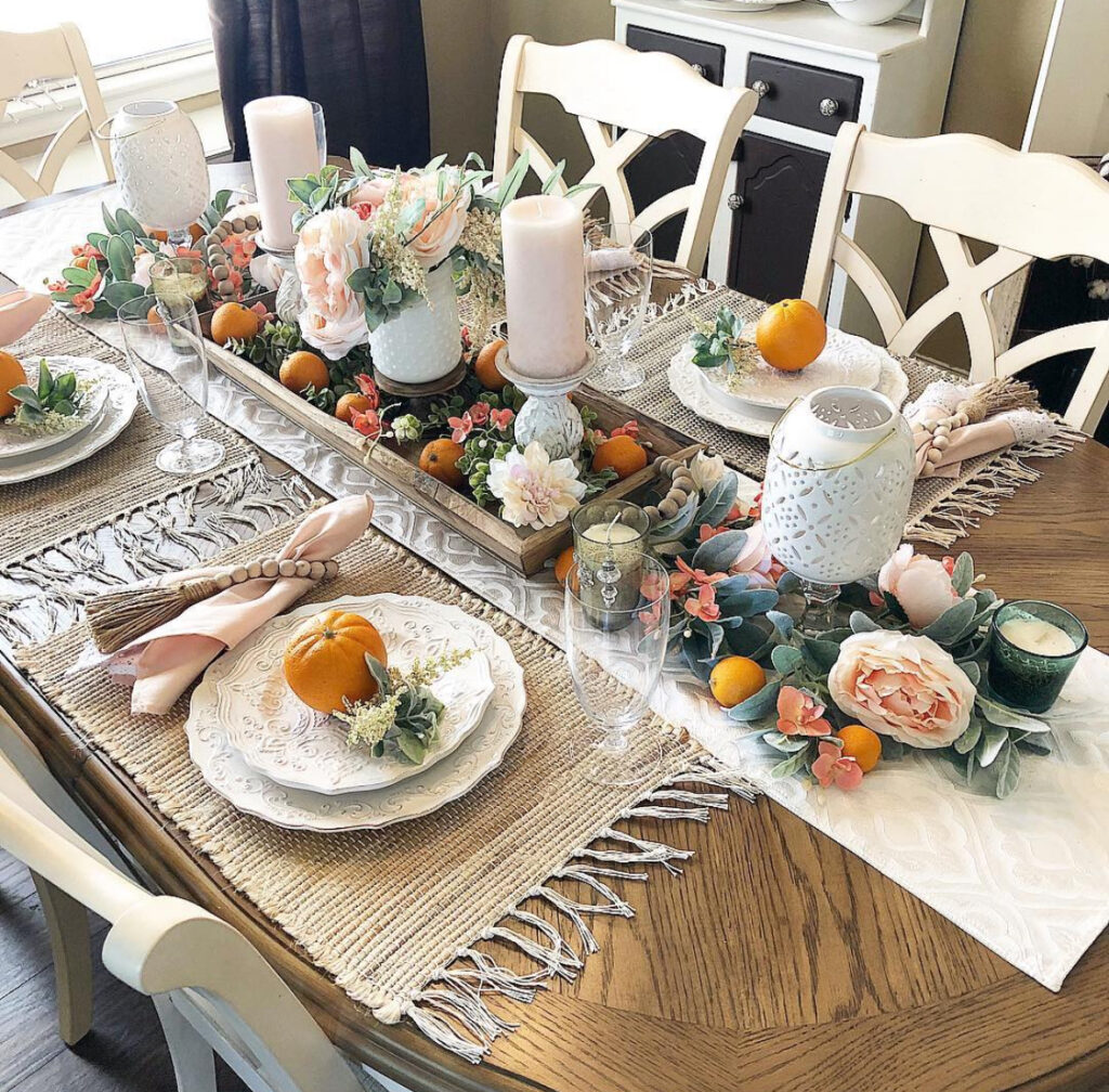 I didn’t expect citrus to feel so autumnal, but the mandarins with blush florals and pale candles are MAGIC—soft, bright, and cozy all at once. Saving this under fall kitchen table decor ideas because it turns an ordinary dinner into a sweet little moment.