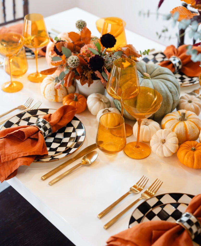 Amber stemware, checkerboard plates, and a pile of pumpkins—this one brings the fun. The orange napkins tie it all together and suddenly you’ve got bold, happy tablescape ideas for fall with zero stuffiness.