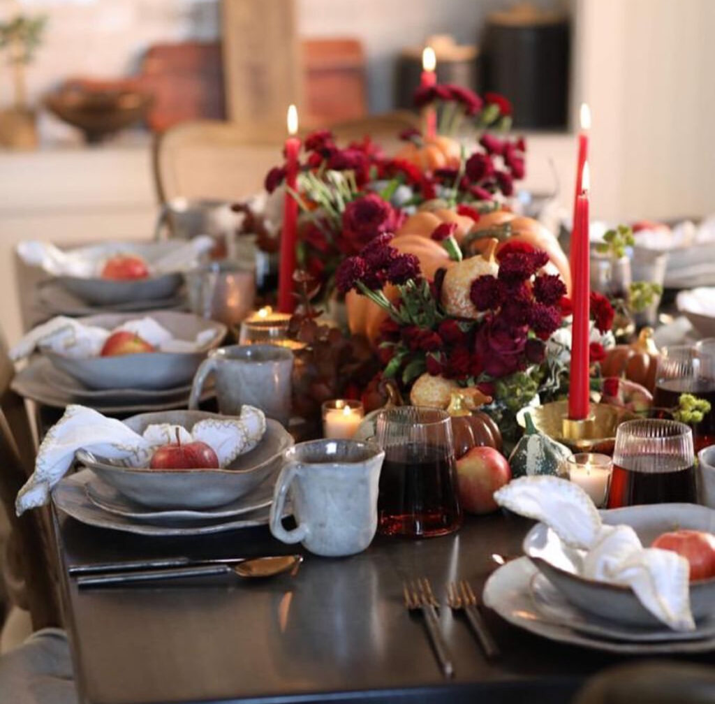 Moody reds, tapered candles, and little apples tucked in each bowl—so lush and a tiny bit romantic. If you’re after layered, cozy dining table decor, this one is a showstopper.