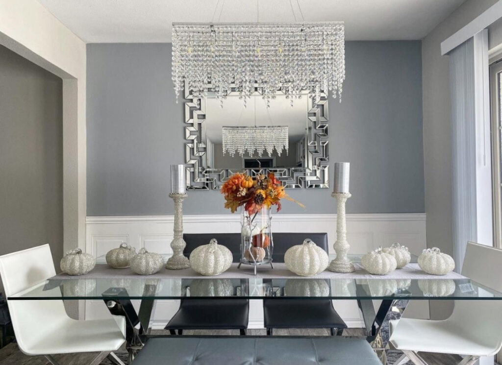 A glass table with glittered pumpkins, tall metallic candlesticks, and a mirror-y chandelier—glam without feeling cold. The warm florals keep it grounded, making it feel surprisingly approachable.