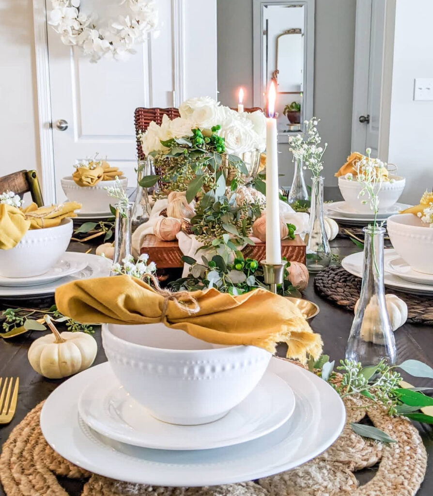 Knotty mustard napkins perched on simple white bowls, a garland of eucalyptus, and creamy flowers—it’s light, airy, and inviting. Consider this the poster child for simple fall tablescapes that still look thoughtfully pulled together.