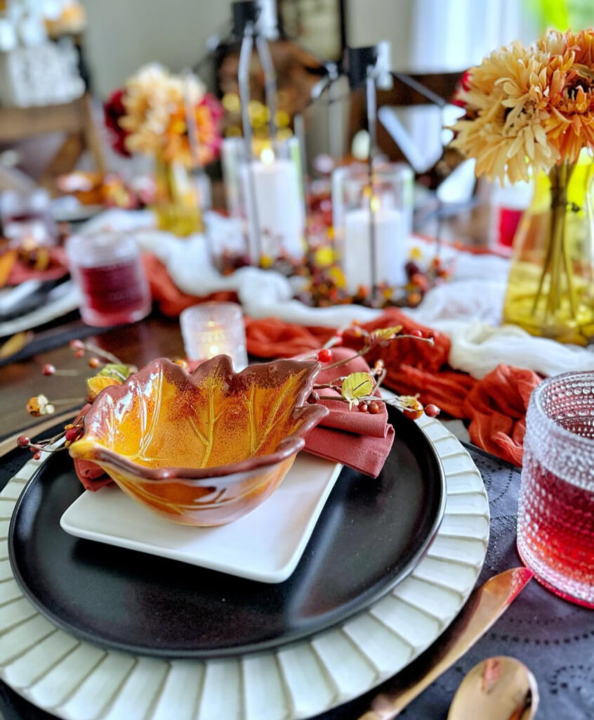 A scalloped charger, matte black dinner plate, and that glossy leaf bowl—so good. With coppery flatware and berry sprigs, it’s layered and cozy, aka perfect fall table setting for weeknight-to-weekend dinners.