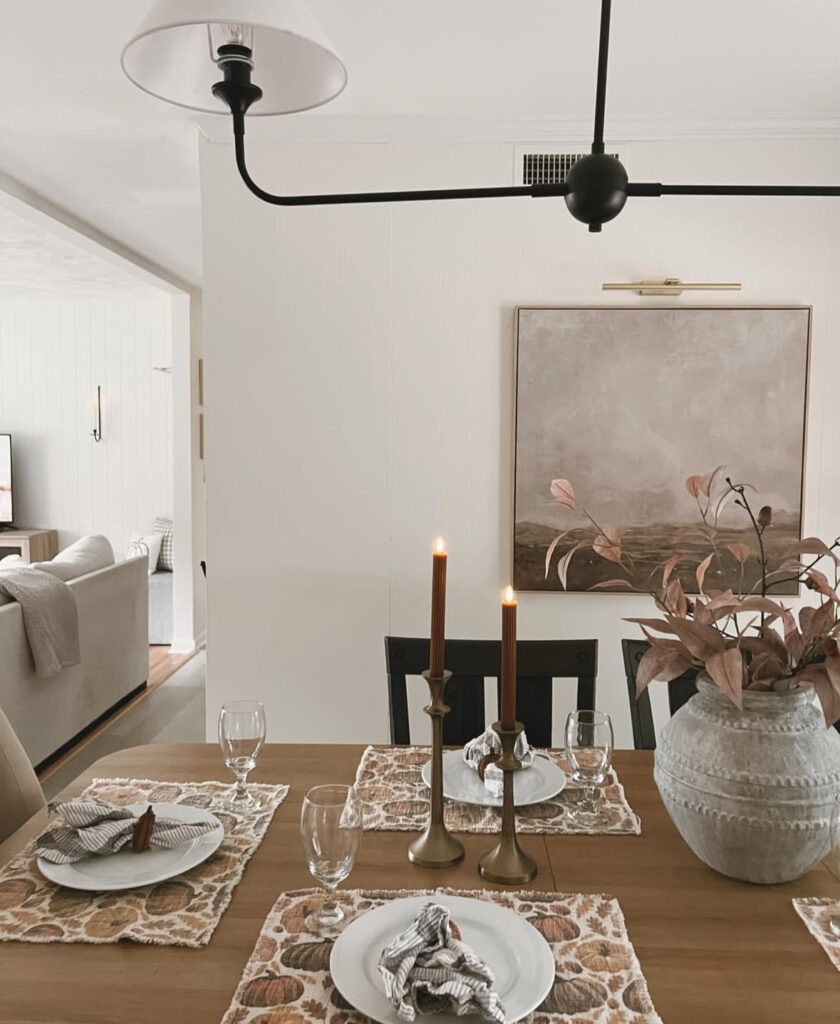 Two slim tapers, pumpkin-print placemats, and a soft, dusty-leaf arrangement keep things quiet in the nicest way. It’s unfussy, warm, and a great snapshot of simple table decor when you’re craving calm over clutter.