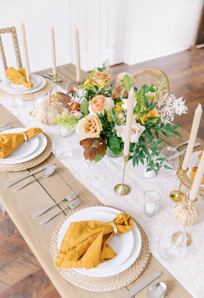 Airy, bright, and so polished—the woven chargers, brass tapers, and garden-y centerpiece make the whole table feel effortless. The mustard napkins bring the sunshine, and I’m filing this under fall dining table decor ideas immediately.