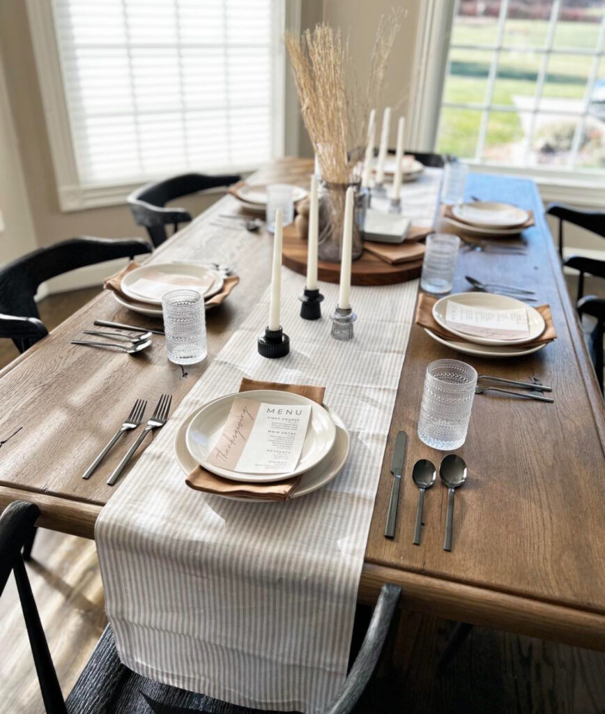 Clean stripe, slim candles, black flatware—so crisp. If you’re collecting thanksgiving & fall table runners decor ideas, this one is proof that pared back can still feel special (menus = easy pro move).