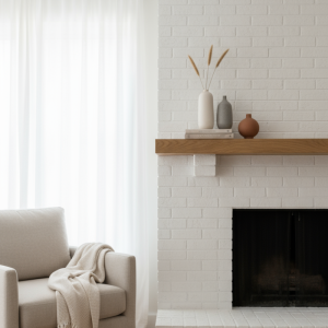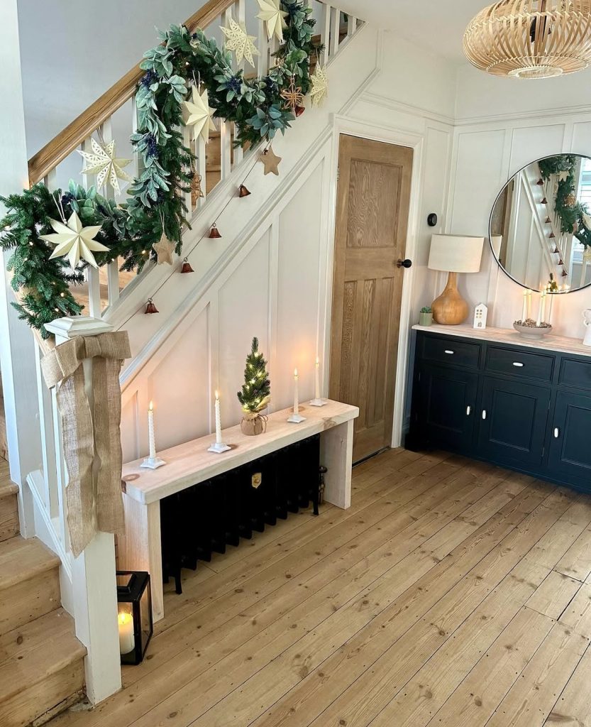 Chunky garland loops low with pale stars and tiny bells—hushed, handmade, beautiful. The slim candles and burlap bow keep it unfussy…“December, but zen.” The tall mirror echoing the garland’s curve—subtle drama.