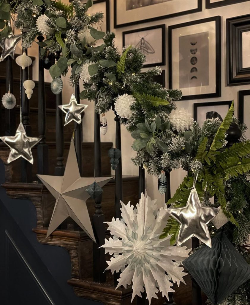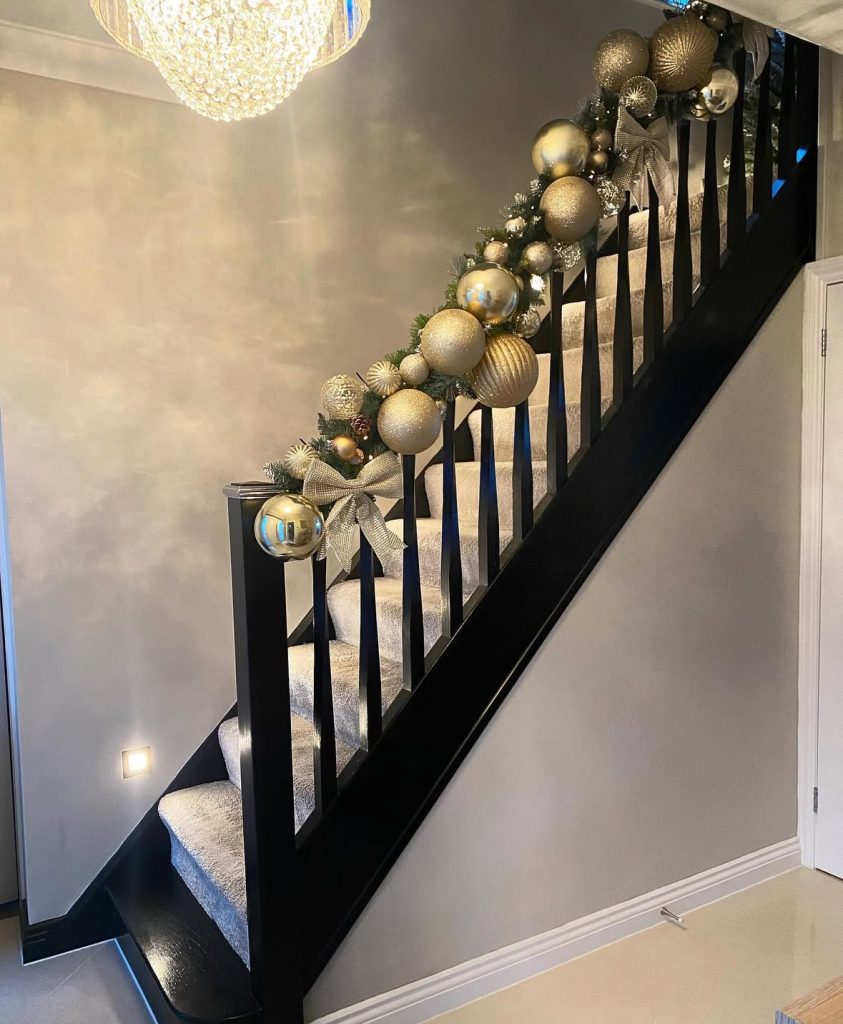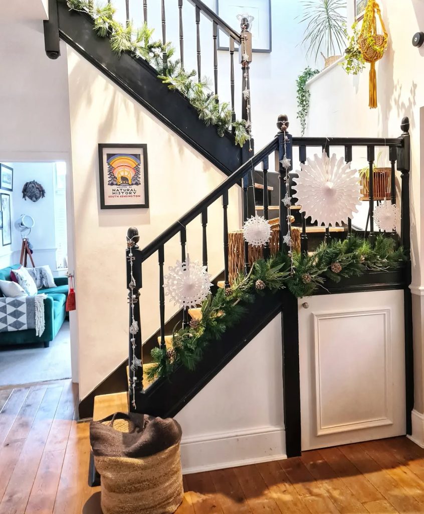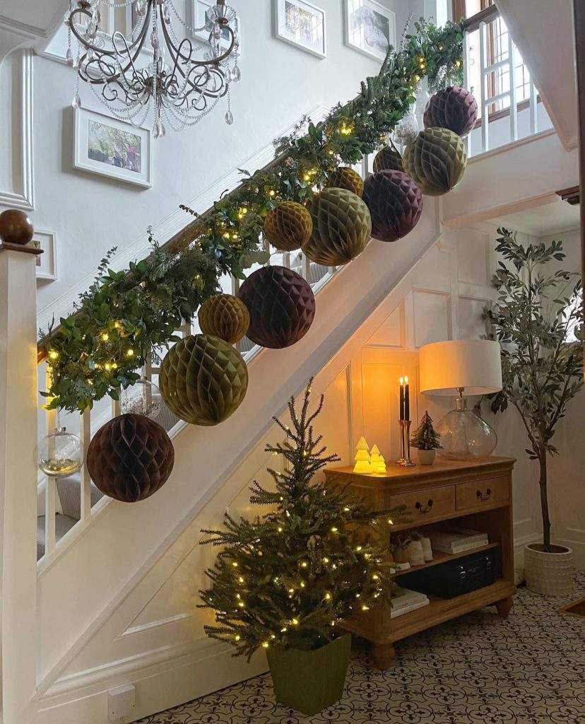 Looking for garland on stairs ideas with ATTITUDE? Try oversize stars, honeycomb ornaments, and a few frosted blooms against a dark gallery wall – instant theater. It’s giving “editorial loft meets enchanted forest”.
