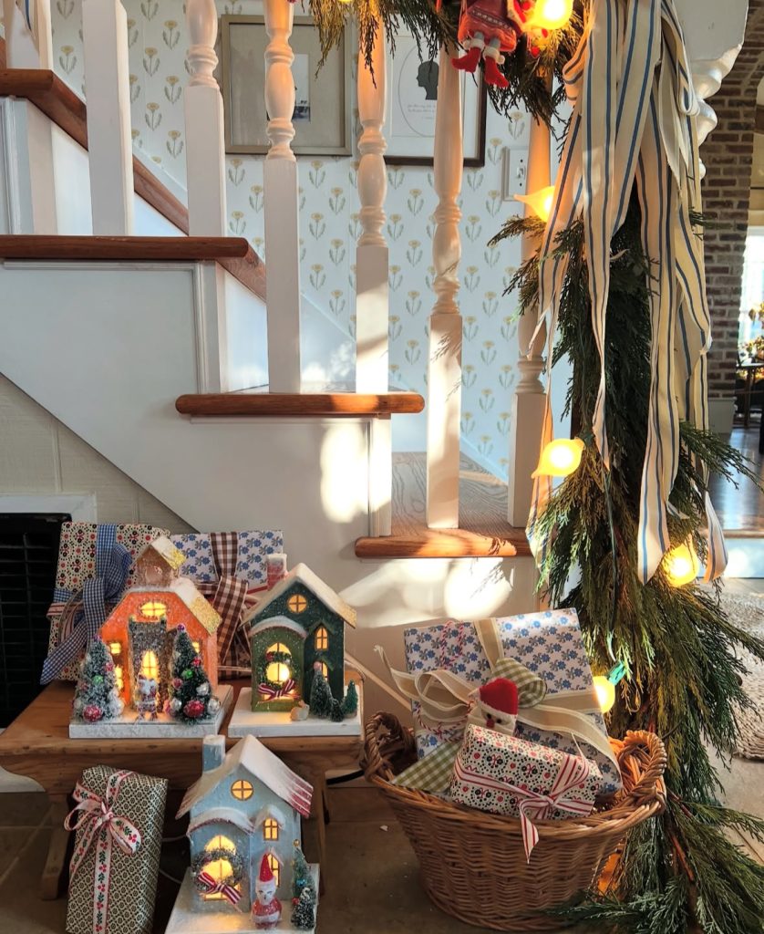 Need Christmas decorations for stairs that charm at eye level? Cluster a glowing village, ribboned packages, and drapey cypress at the base – mini magic show. What I love here: the storybook scale (small houses, big wonder!).