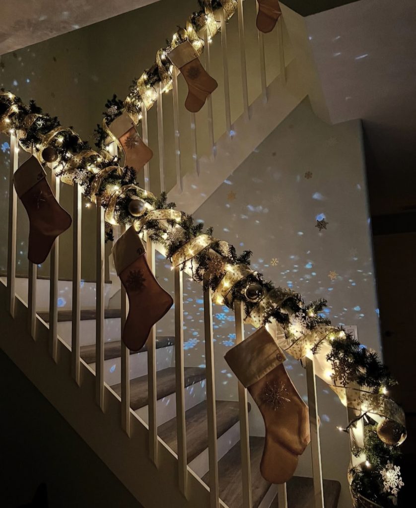 Bookmark this for Christmas lights on stairs ideas: twinkle strands + wide shimmer ribbon + stockings marching up the rail. Then, boom, add a snowflake projector for that dreamy wall sparkle (instant “walking in a snowfall,” indoors). Cozy % elevated = 100%.