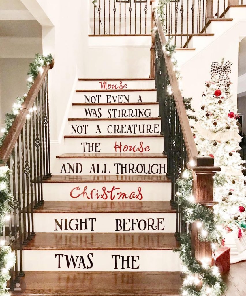 The poem on the risers turns the staircase into a read-aloud path – kids sprinting up for “just one more line,” anyone? Garlands trail the rails while a white tree glows nearby; it’s Pinterest-famous material, for sure. I like the black-and-red lettering mix—playful and classic—and the whole thing feels like a stage set for cocoa nights.