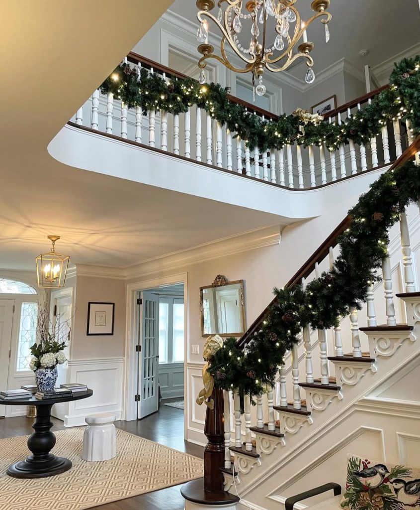 File this under Christmas staircase garland ideas / “timeless never fails.” Thick greens, pinecones, and warm lights trace the rail, finished with a single gold bow—simple…yet so grand. Feels like a set from a Nancy Meyers movie, right?! (AD house tours would totally nod along.)