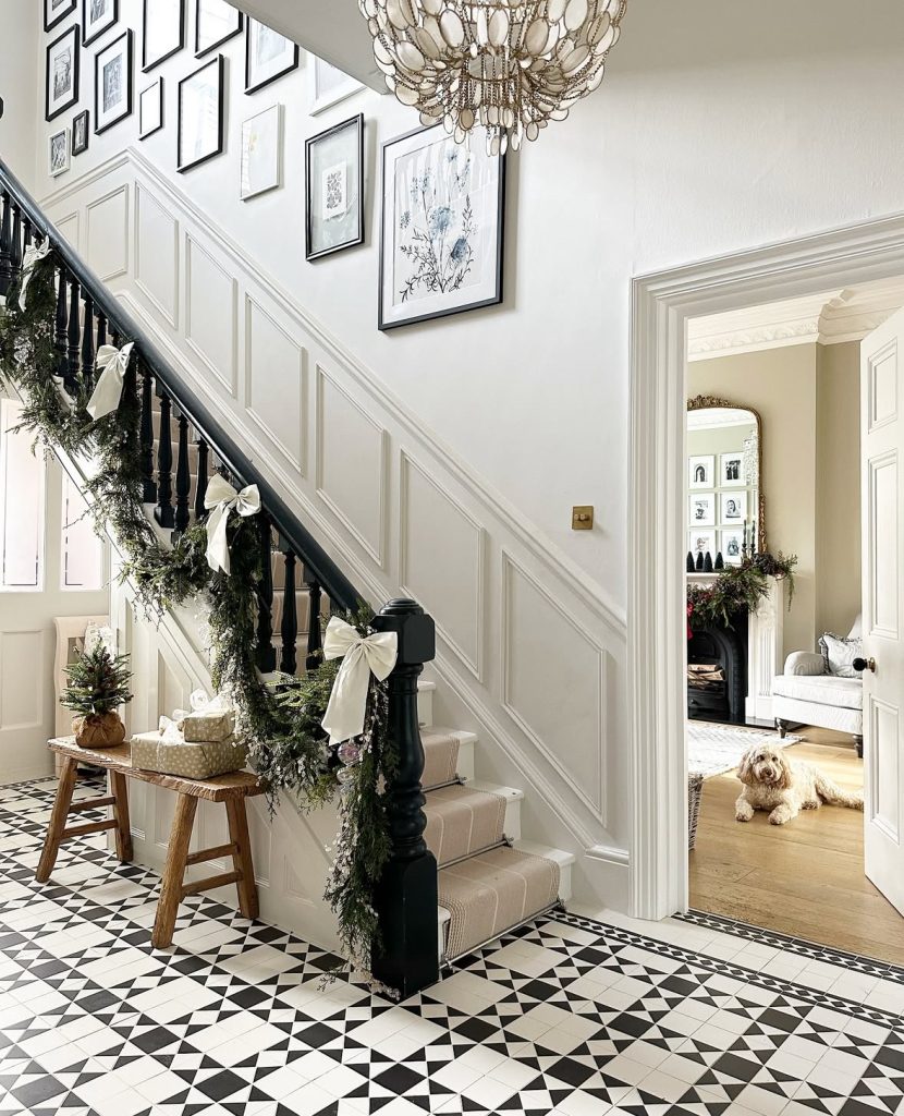 Black banister, ivory bows, and frosted greens play off that graphic tile—HELLO, stylish foyer. The gallery wall climbs with you, and that capiz chandelier?—a snowflake in disguise. This could slide straight into an Elle Decor holiday roundup, no notes.