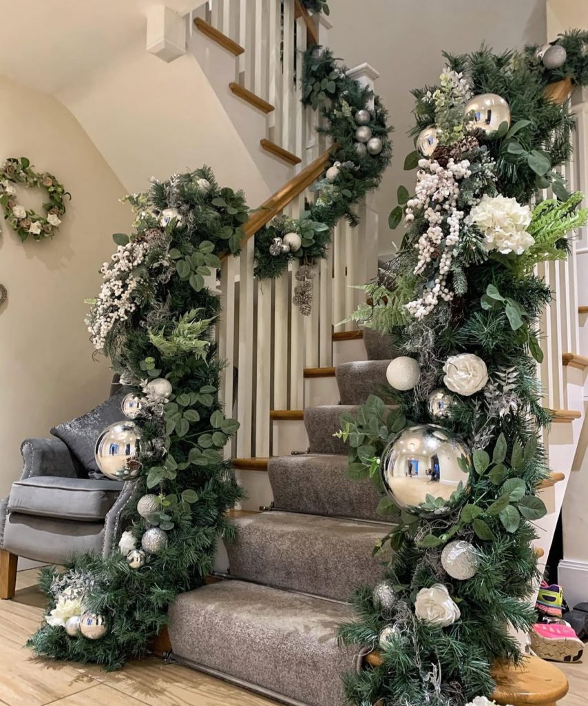 A CHRISTMAS STAIRCASE with serious drama!! Glossy silver baubles, frosted berries, and eucalyptus swoop around the newels like couture ruffles (because…why not?). It’s got that glam foyer vibe.