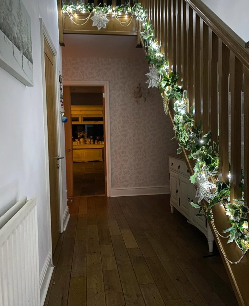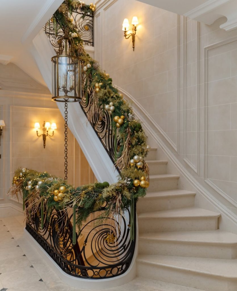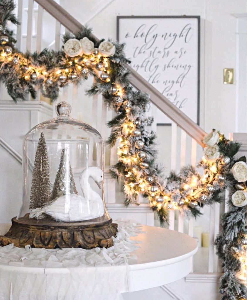 For staircase Christmas decorations ideas that whisper “winter ballet,” layer flocked garland, blush-white roses, and candlelit sparkle. The cloche with a swan centerpiece, are we in a fairytale or what?! What I like most: the soft glow that wraps the banister and floats into the room (quiet luxury at its sweetest).
