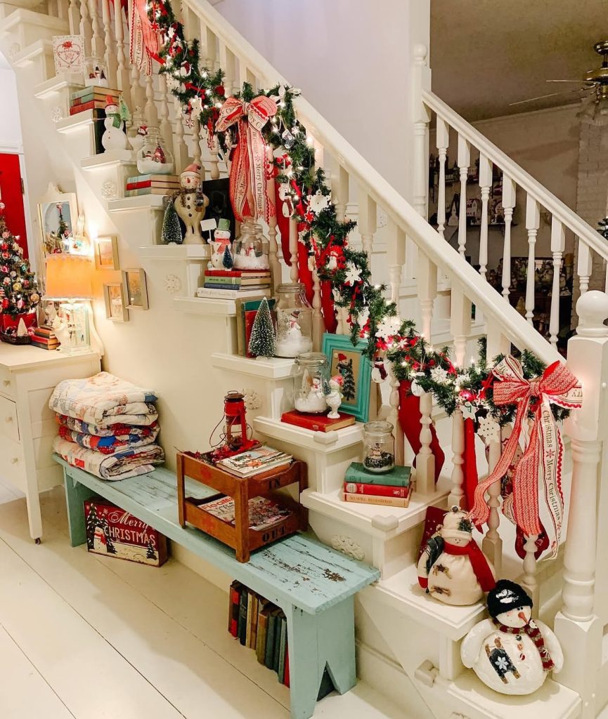 Old-school charm turned up to ELEVEN—snowmen, quilts, books, and tiny trees tucked onto every step (the little shelves are doing the MOST). The candy-striped bows and twinkly garland feel like a storybook exploded—in the best way. I’ve seen a cottagey setup like this on Dolly Parton’s holiday IG—cozy, collected, and a little cheeky. What I love most: those stacked books as mini pedestals—smart + sweet.