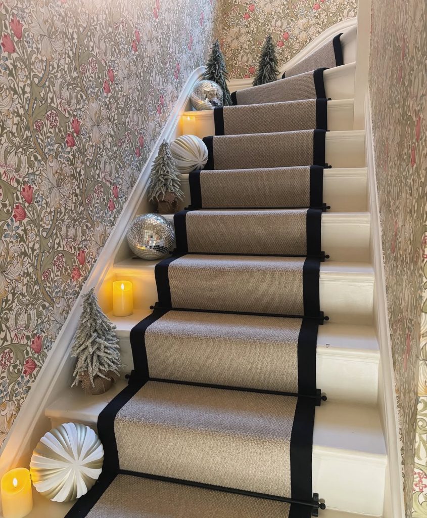 Flocked mini trees, flameless candles, and…disco balls on the treads (why NOT?!). Against that Arts & Crafts wallpaper the sparkle feels cheeky and fresh.