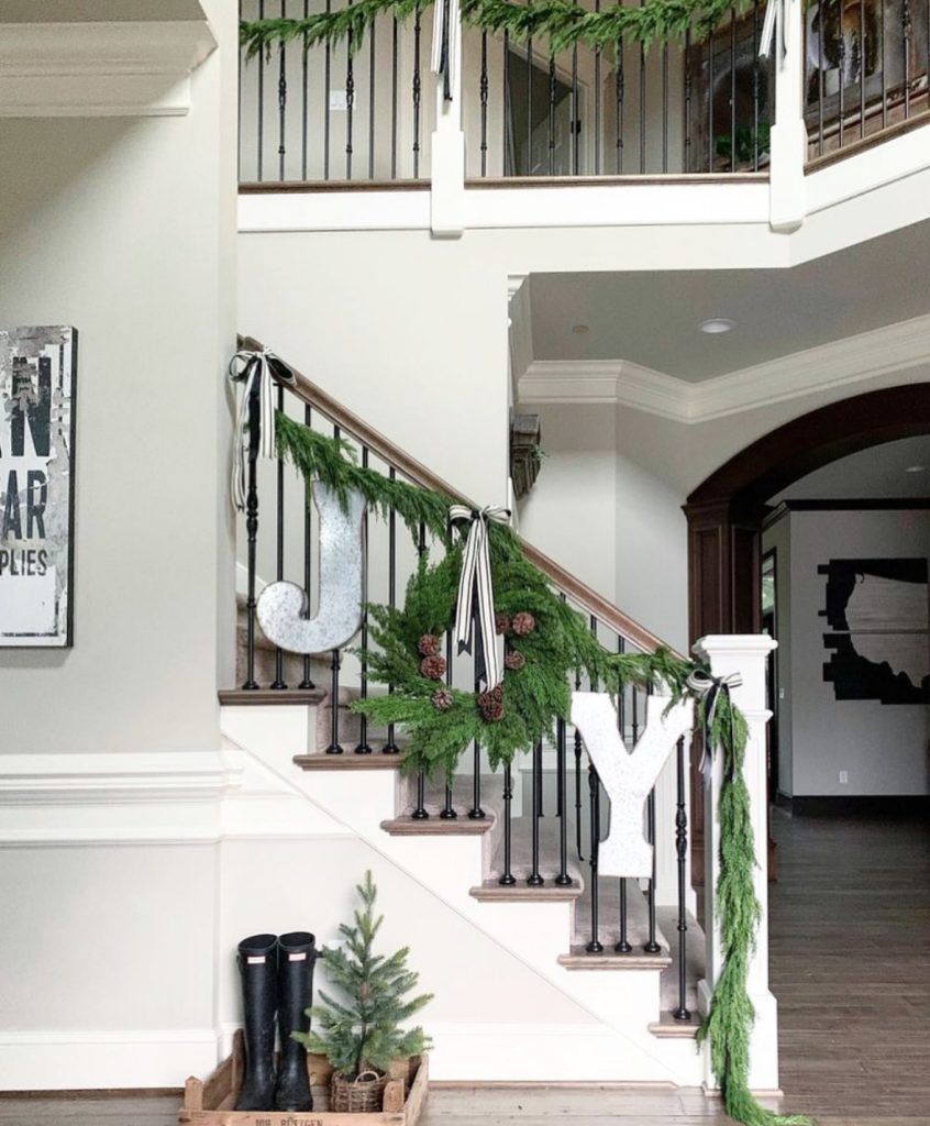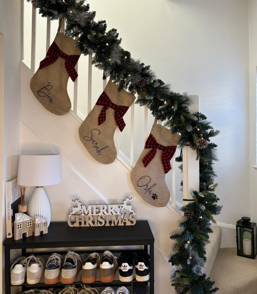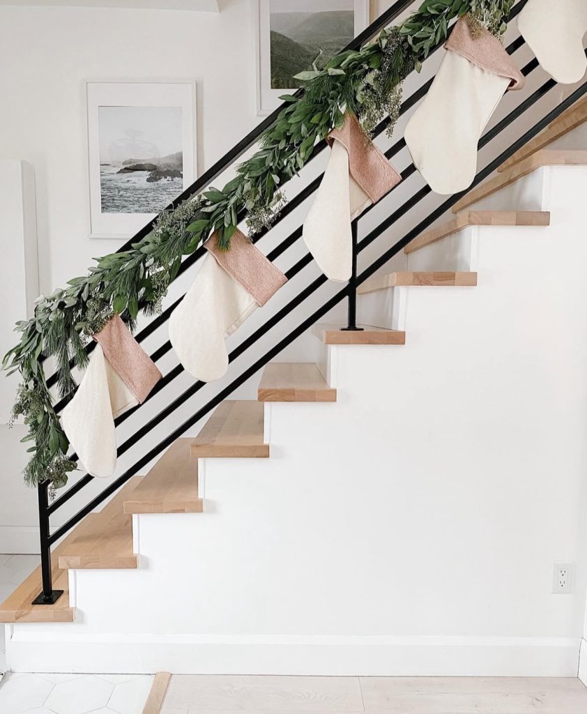 A modern Christmas staircase done right – clean black rail, airy greens, and those creamy stockings drifting like snowdrifts. No fuss, all feeling…(and yes, Apartment Therapy would approve). What I like about this design: the negative space! It lets the greenery breathe and the stockings become the star.