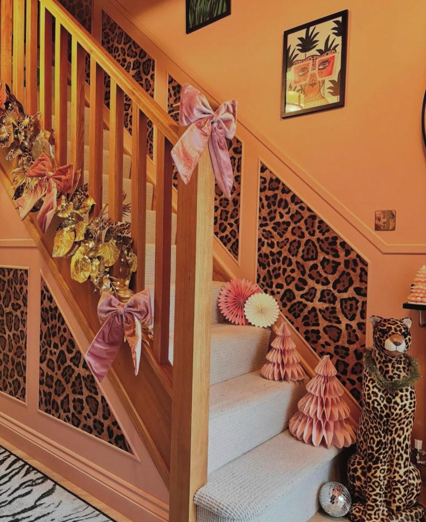 How to decorate stairs for Christmas when your hallway already SLAYS? Lean in velvet bows, gilded leaves, and a little disco glint against leopard panels.. YES.