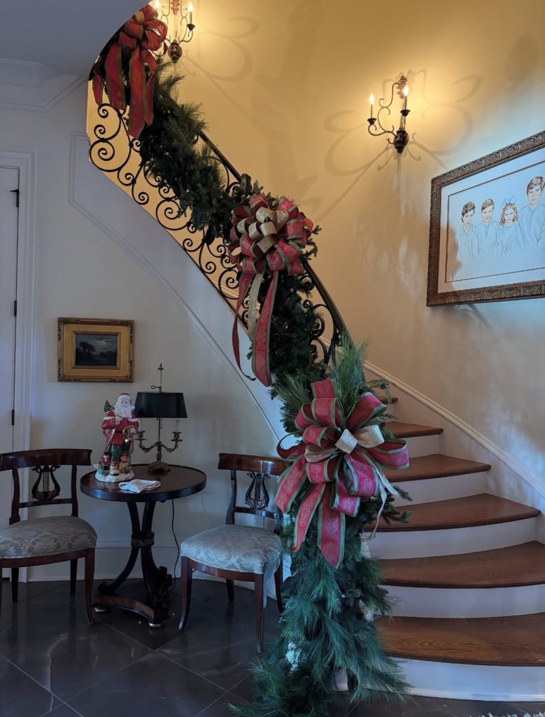 Those red-and-gold statement bows ride the wrought-iron curve like couture—formal, Southern, timeless. A tabletop Santa and candle sconces finish the vignette…because of course they do.