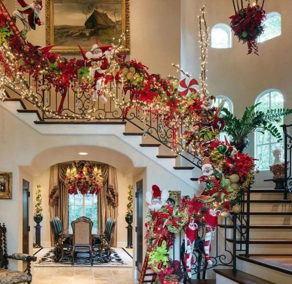 More is MORE here! Poinsettias, candy canes, Santas, glitter orbs, the whole North Pole on a joy ride. Curvy ironwork plus a blazing garland make the entry feel like a parade float paused mid–“ho ho ho.” It totally resembles the over-the-top sparkle I once saw in Mariah Carey’s holiday mansion tour – festive royalty vibes!! Bonus: the dining room echoing the palette pulls the whole scene together.