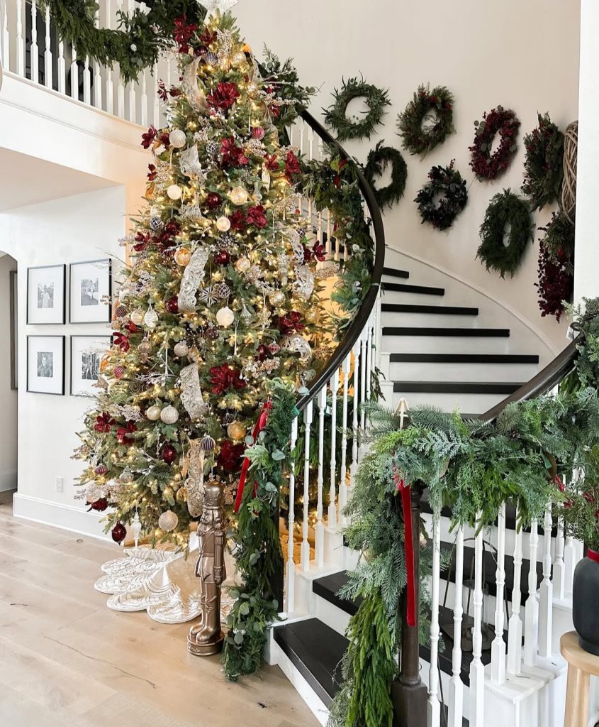 Here’s your playbook for staircase Christmas decorating ideas: lush garland, a towering tree, and a whole GALLERY of wreaths spiraling up the curve – swoon. Red and champagne ornaments do the heavy lifting while velvet ribbons punctuate the greens.