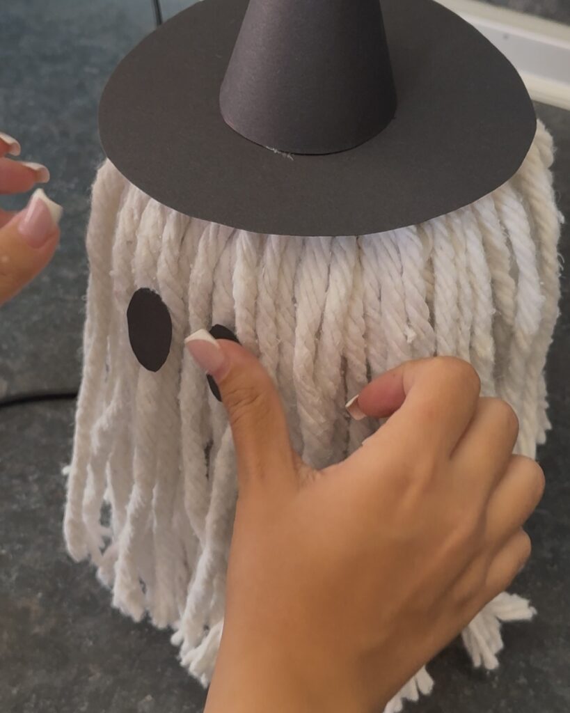 Set the hat on the mop “head.” If you want it permanent, add a tiny dot of glue to the top of the mop cap so the hat stays put.