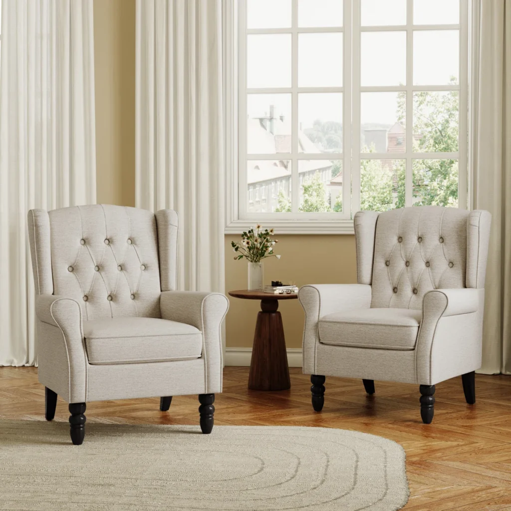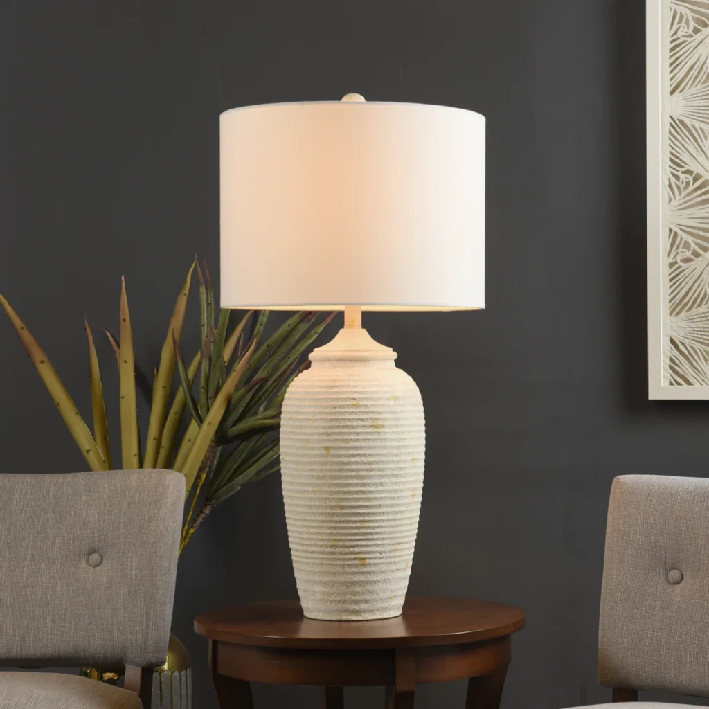 Tufted Accent Chair / Resin Table Lamp / Reclaimed Wood 3 Drawer Bedside