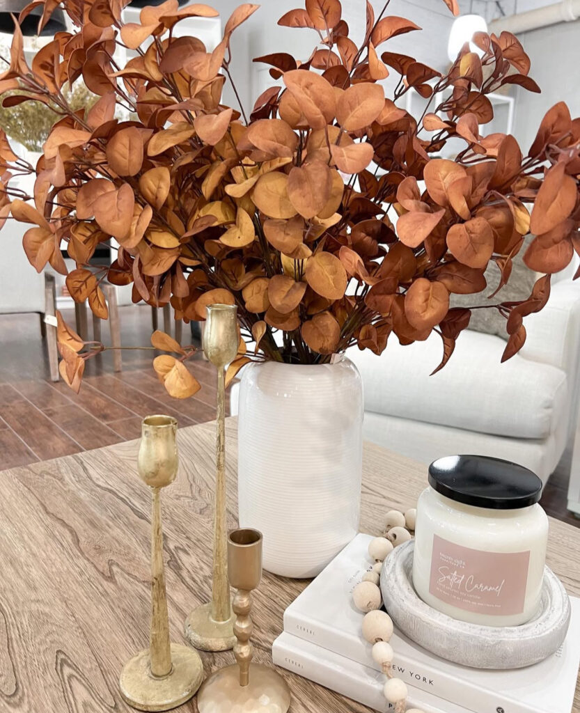Minimal pieces, maximum mood: a ribbed white vase of bronze leaves, slender candlesticks, and a candle on stacked books with a bead strand. Everything’s soft and symmetrical, so it looks styled even on a Tuesday. Great coffee table decor ideas for fall if you prefer neutrals.