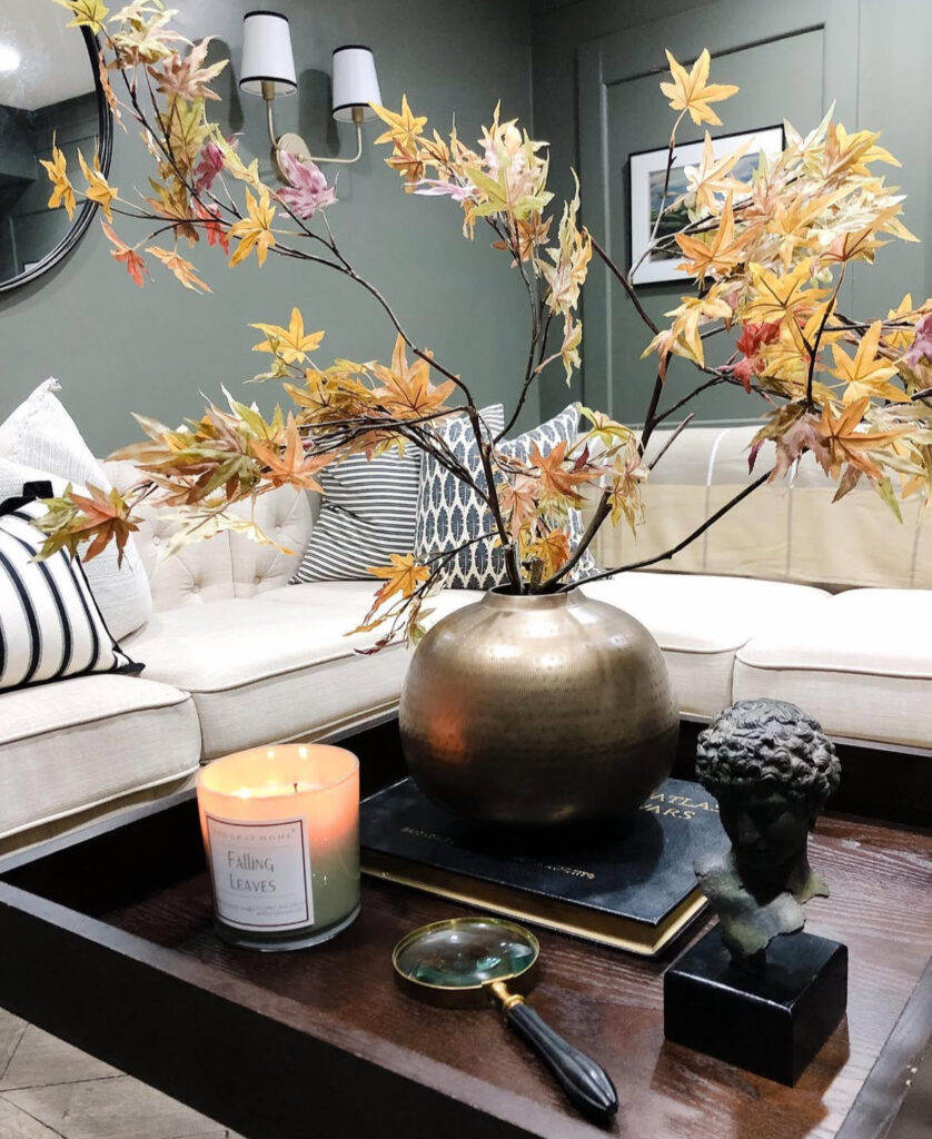 Moody walls plus a burnished vase of wispy branches—this whole scene feels like a quiet library at golden hour. A lit “Falling Leaves” candle, old books, and those quirky objects (hello, magnifying glass and bust) make it read storied, not staged. Steal the mix if you’re into layered coffee table fall decorating ideas that still feel lived-in.