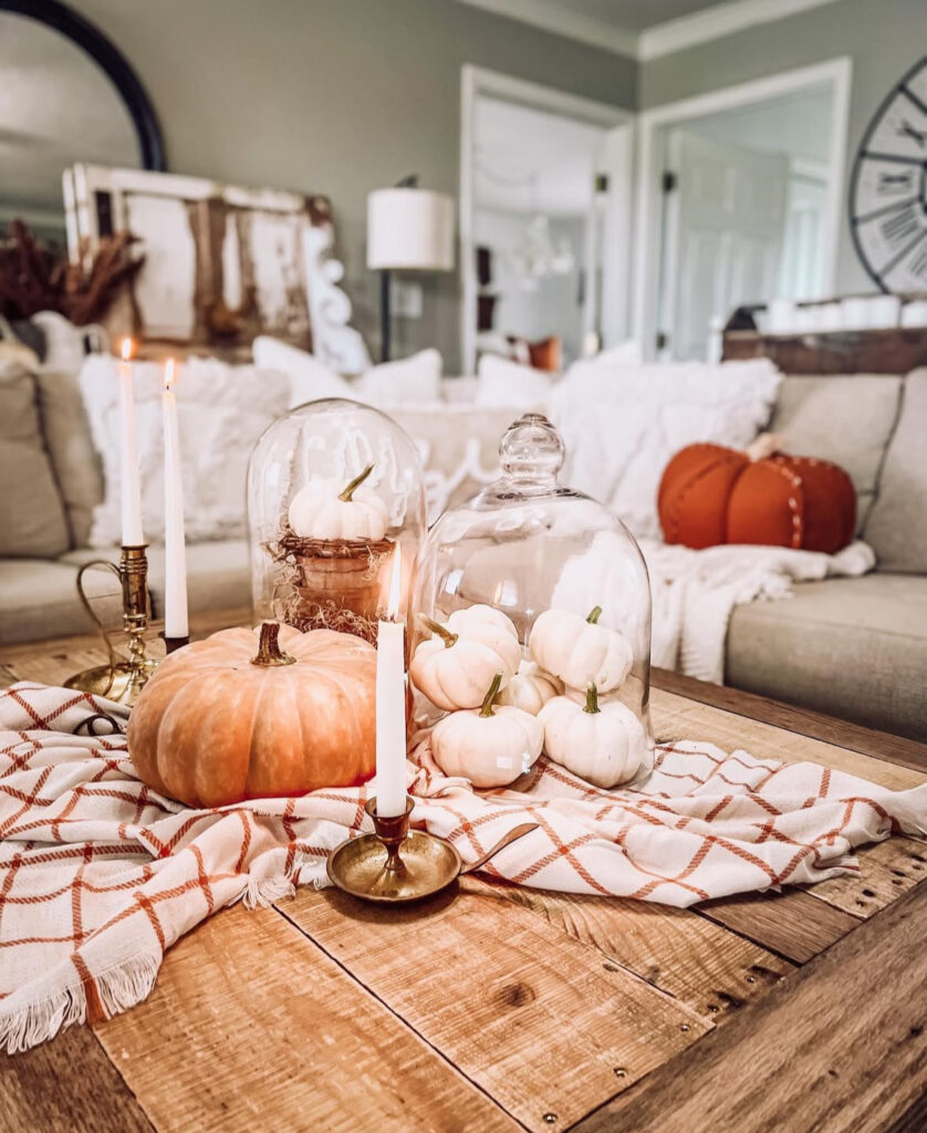 I cannot stop staring at those tiny white pumpkins tucked under glass—instant mood, zero effort. Add brass candlesticks and a plaid throw and the whole space flips to cozy in, like, five minutes (my kind of magic). If you’re collecting fall coffee table decor ideas, this is the fast track.