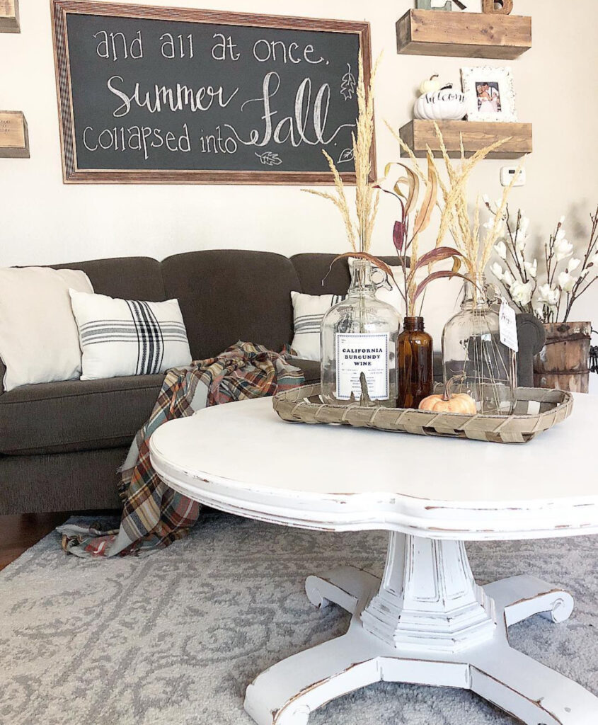 Amber bottles, wheat stems, and baby pumpkins on a weathered pedestal table—it’s giving cozy cider mill (in the best way). The plaid throw and handwritten quote tip it into storybook territory. Easy, approachable fall coffee table decorating ideas that still feel personal.
