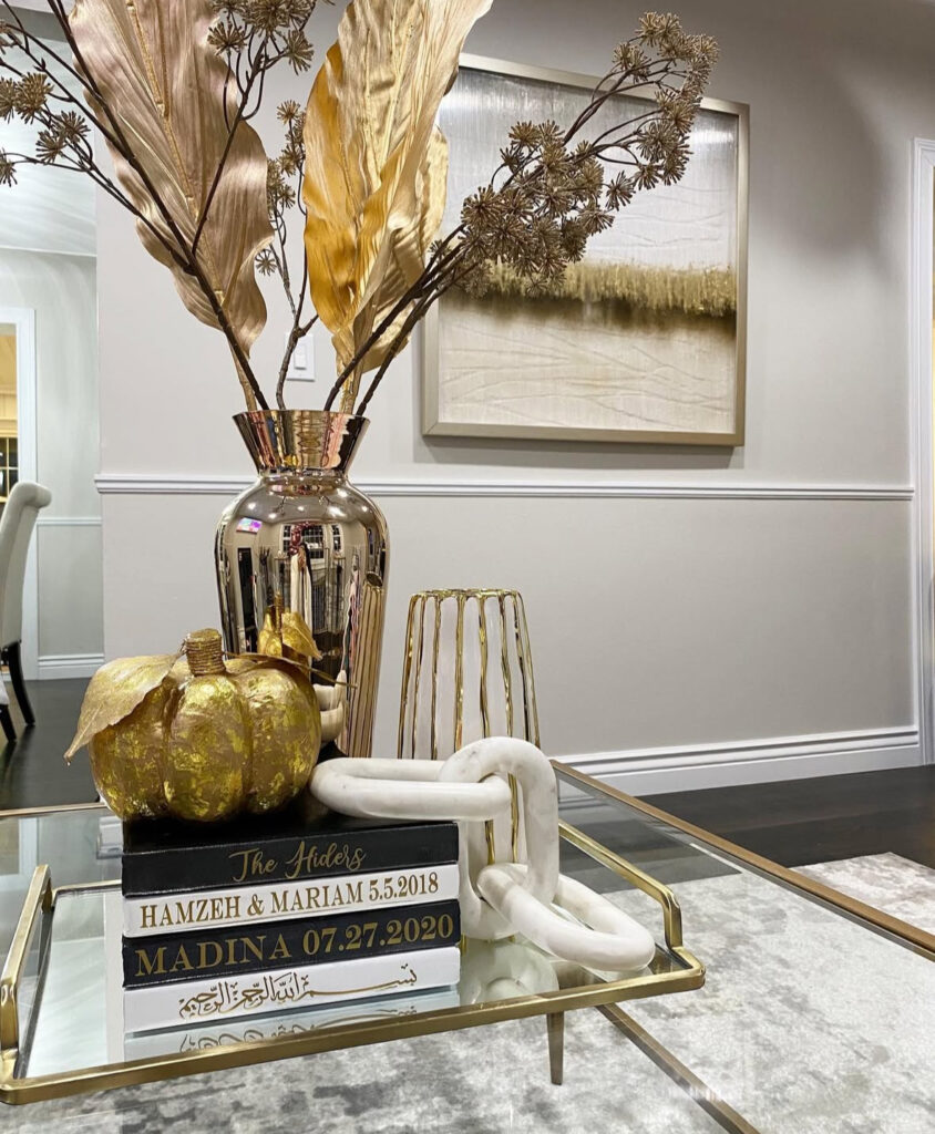 High-gloss gold meets soft neutrals and I’m here for the glow—leafy stems, a gilded pumpkin, and a marble chain on personalized books. It’s luxe but still livable, and that glass top keeps everything light. File under glam fall decorations for coffee table and sleek coffee table fall ideas.