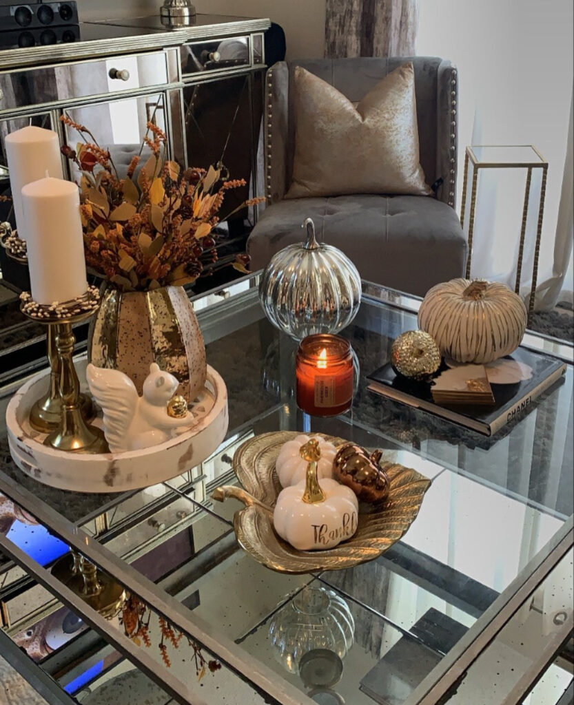 Glass, gold, and glossy pumpkins catch every flicker from that amber candle (it practically sparkles). Grouping everything on small trays keeps the shine from feeling chaotic. File this under luxe-leaning fall coffee table ideas when you want drama in the best way.
