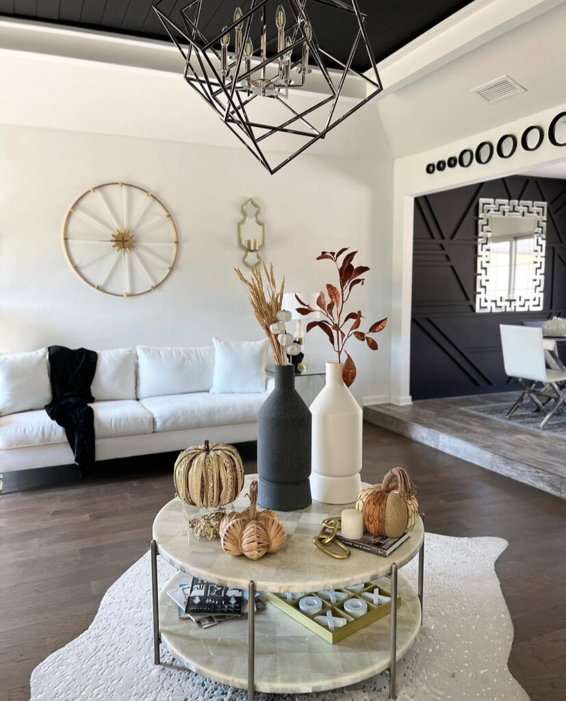 Tall matte vases, woven pumpkins, and a few playful objects make this marble round feel curated without trying too hard. The shapes do the heavy lifting, the autumn tones add the warmth. Such chic fall coffee table decor when you want seasonal without going rustic.