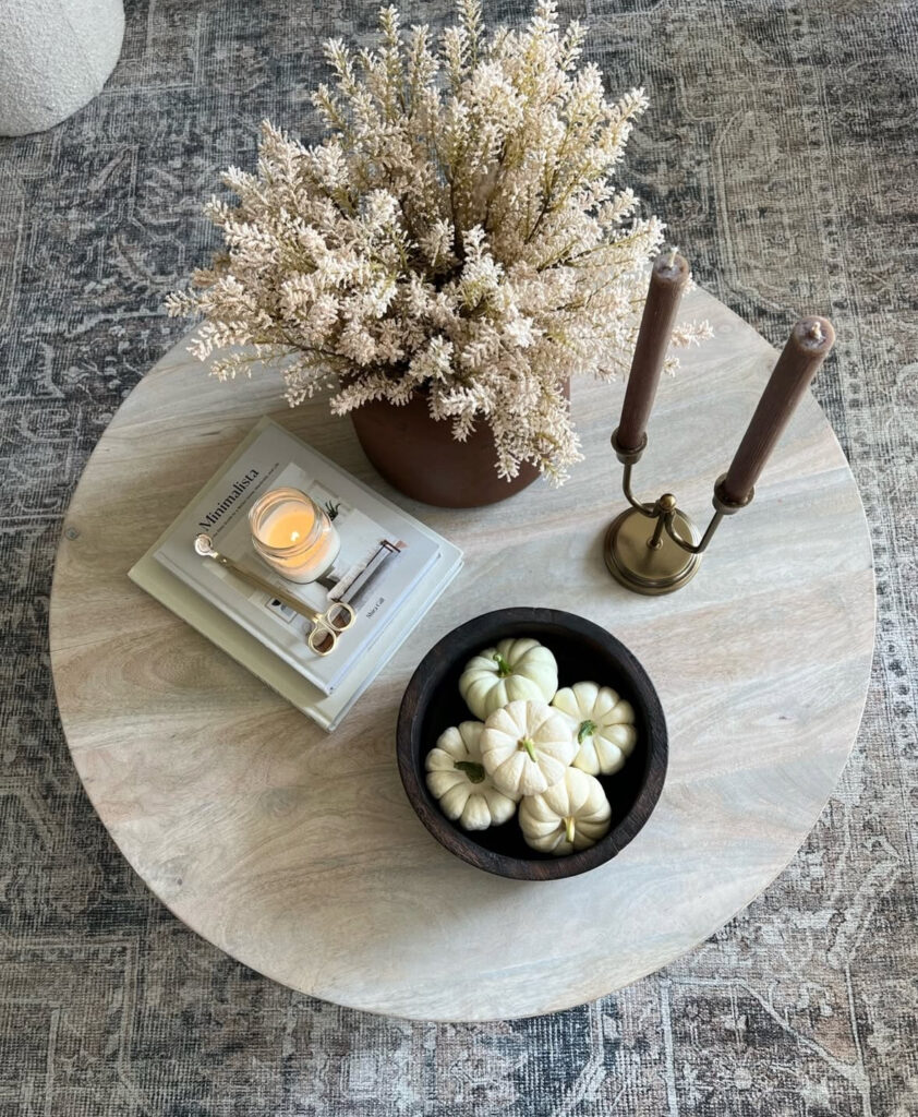 Rattan, stoneware, and smooth pumpkins on a tight round tray—simple combo, big payoff. The donut vase with dried fluff gives height while the candle keeps it cozy. Such an easy template for fall coffee table centerpiece ideas.