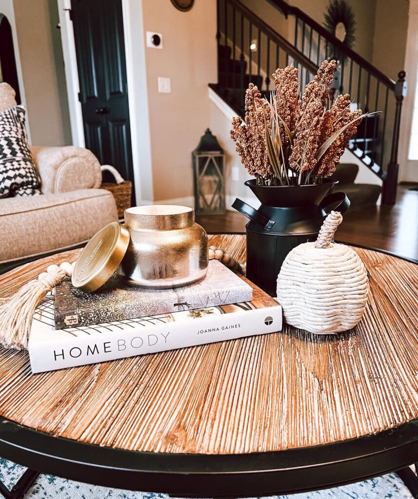 A gold-lidded candle, black tin vase of grain, and a woven pumpkin perch on favorite reads—cozy layers that feel collected. The textures do all the talking (and the scent probably seals the deal). Easy coffee table fall decor ideas when you want warmth in minutes.