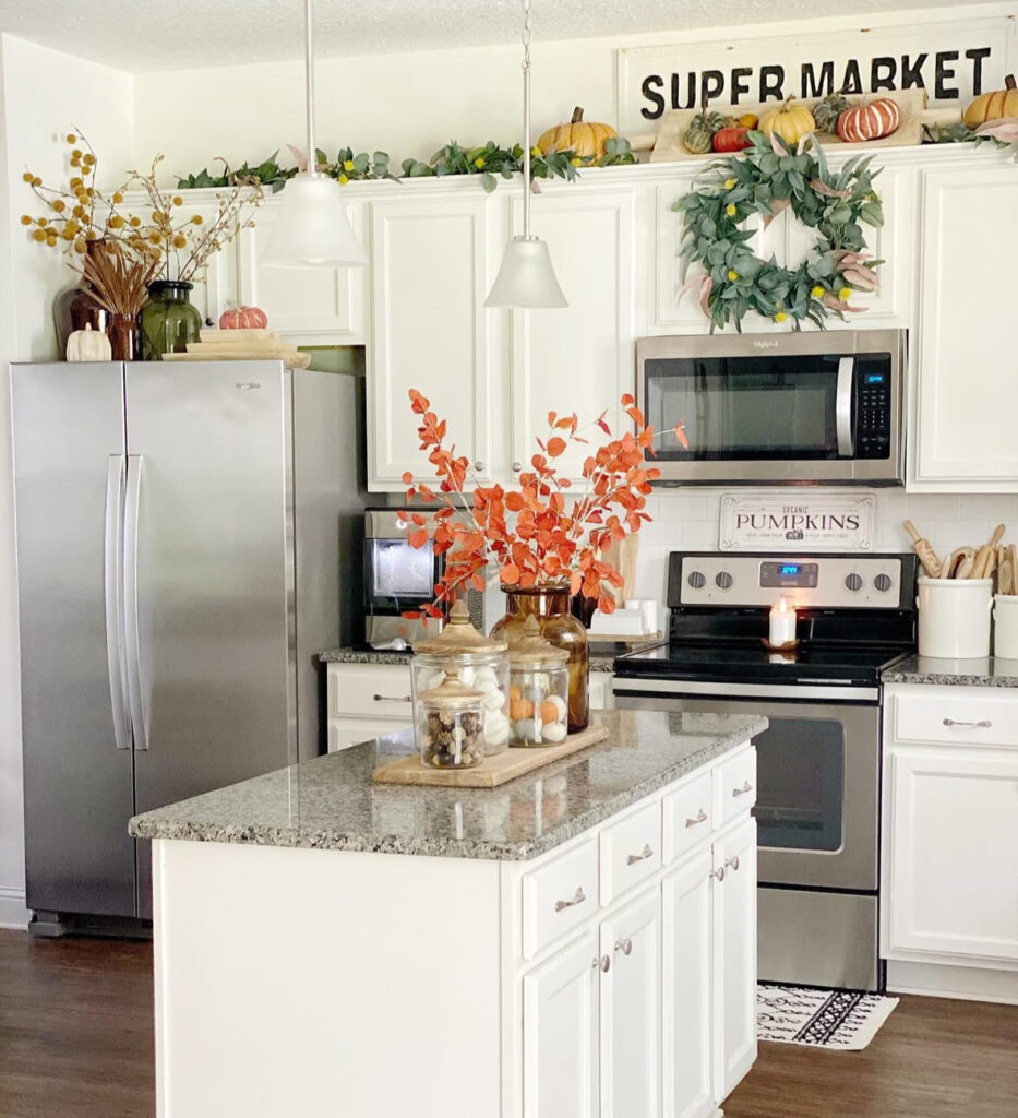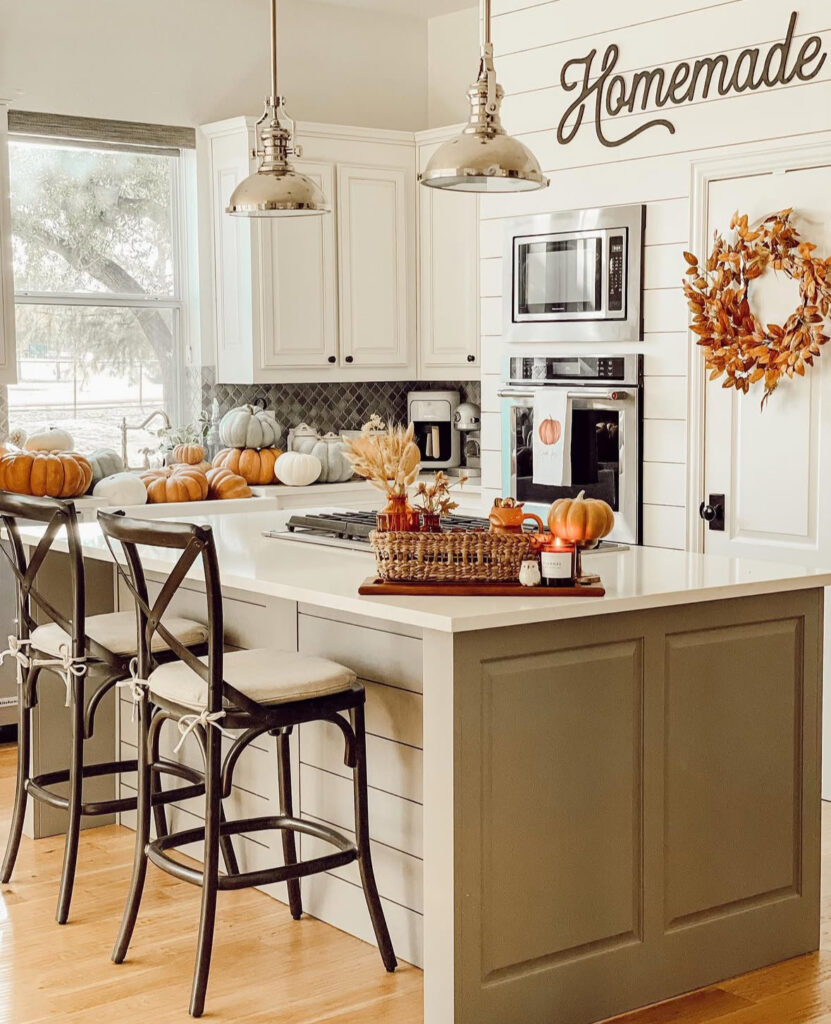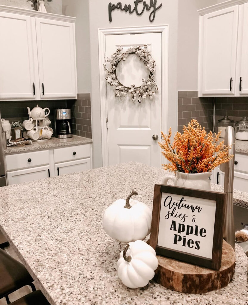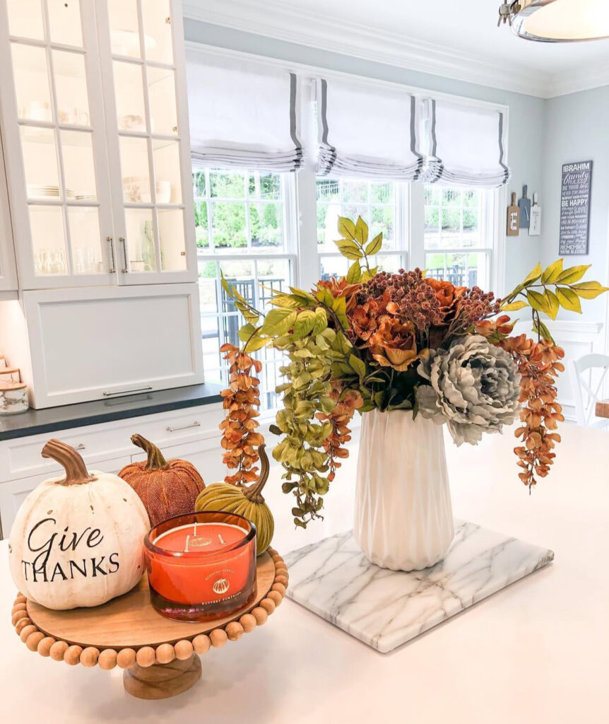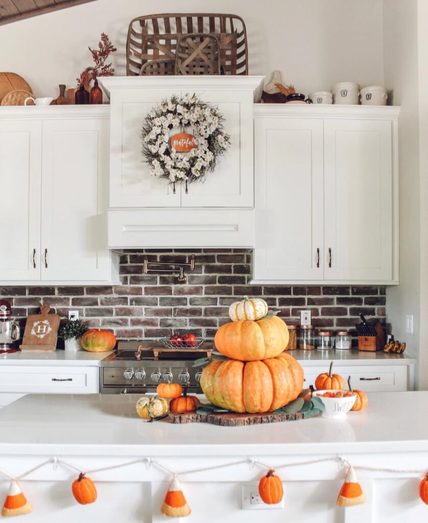 If your kitchen skews light and bright, try a monochrome centerpiece: white pumpkins nestled into soft greenery down the island. It’s elegant white fall decor and the kind decor that doesn’t fight your finishes.
