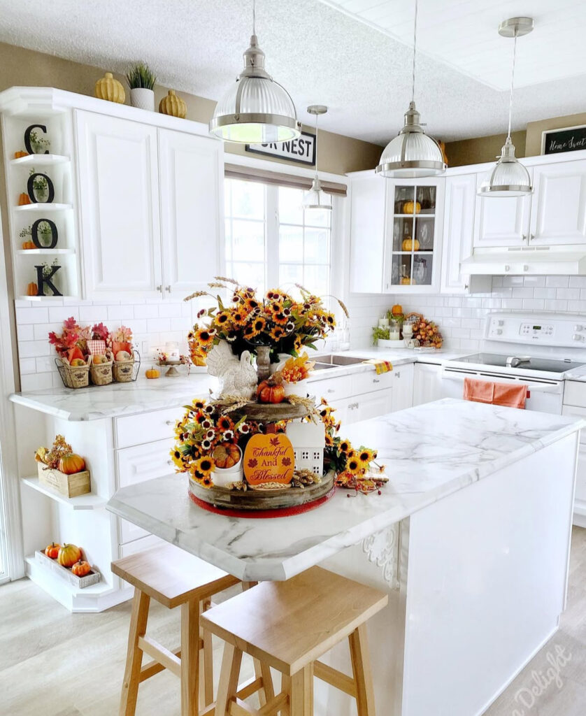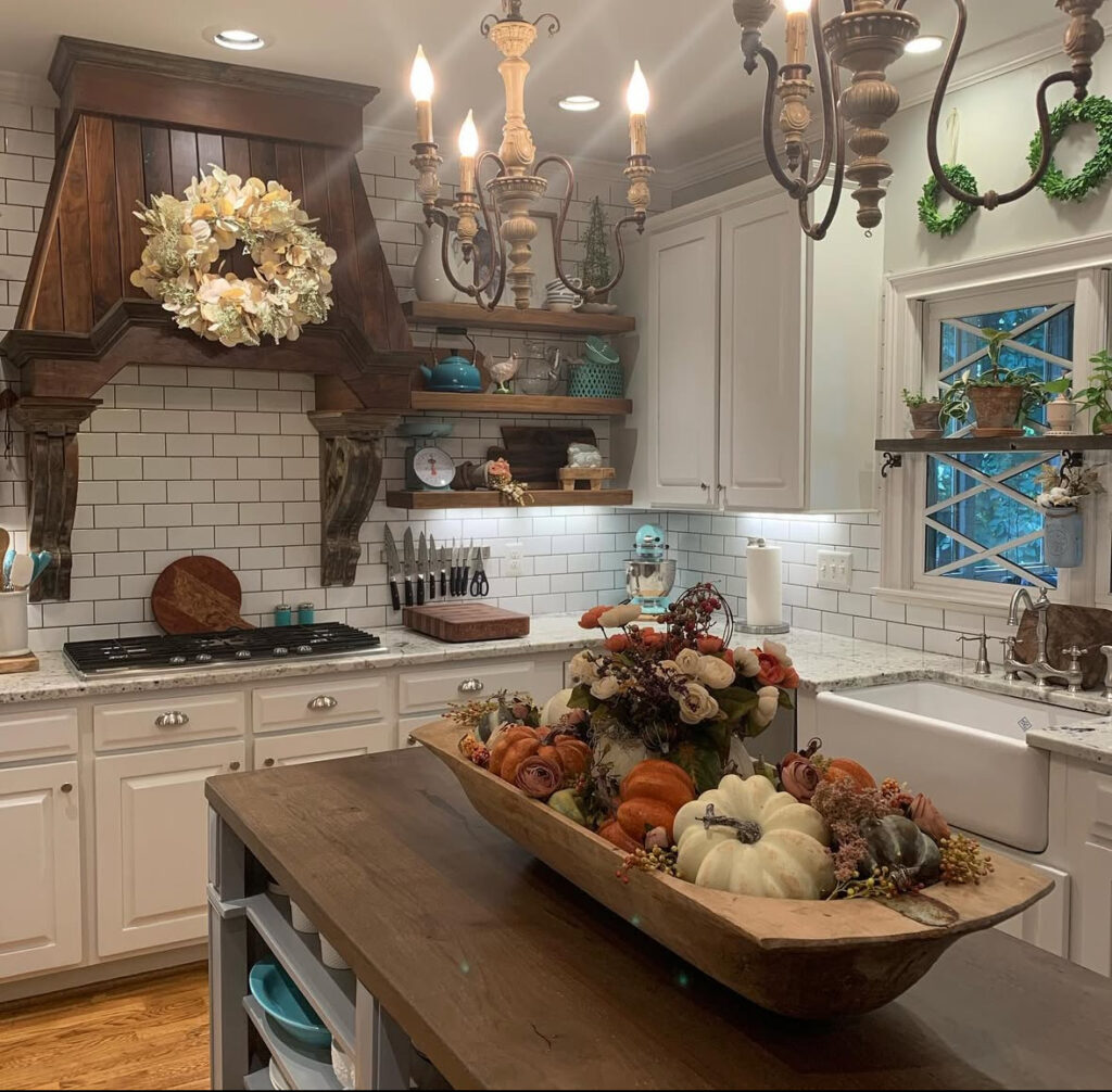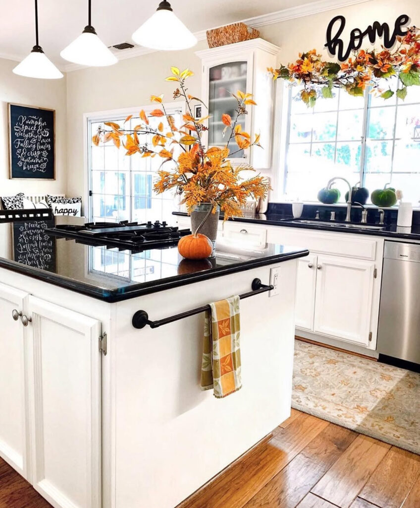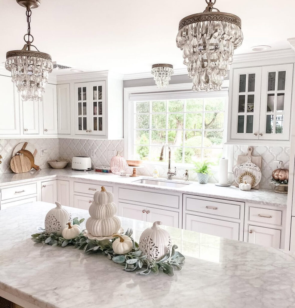 If your kitchen skews light and bright, try a monochrome centerpiece: white pumpkins nestled into soft greenery down the island. It’s elegant white fall decor and the kind decor that doesn’t fight your finishes.