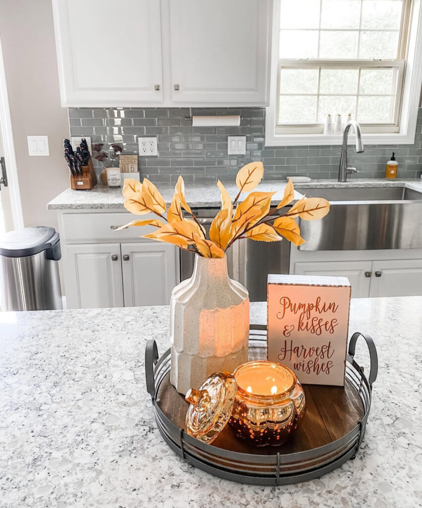 On busy nights, I corral everything onto a round tray: one vase with leaves, one cozy candle, one little sign. It’s portable kitchen counter fall decor that you can slide out of the way when it’s time to chop onions (ask me how I know).