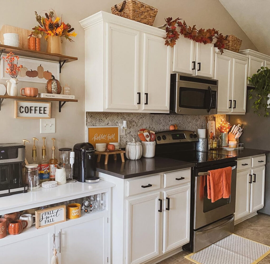 I love a seasonal coffee zone—line up syrups and mugs, tuck a mini sign in, then run a skinny garland across the top cabinets. It’s practical fall decor in kitchen land, and those shelves prove that a few pumpkins go a long way for the shelf/cabinet decor.