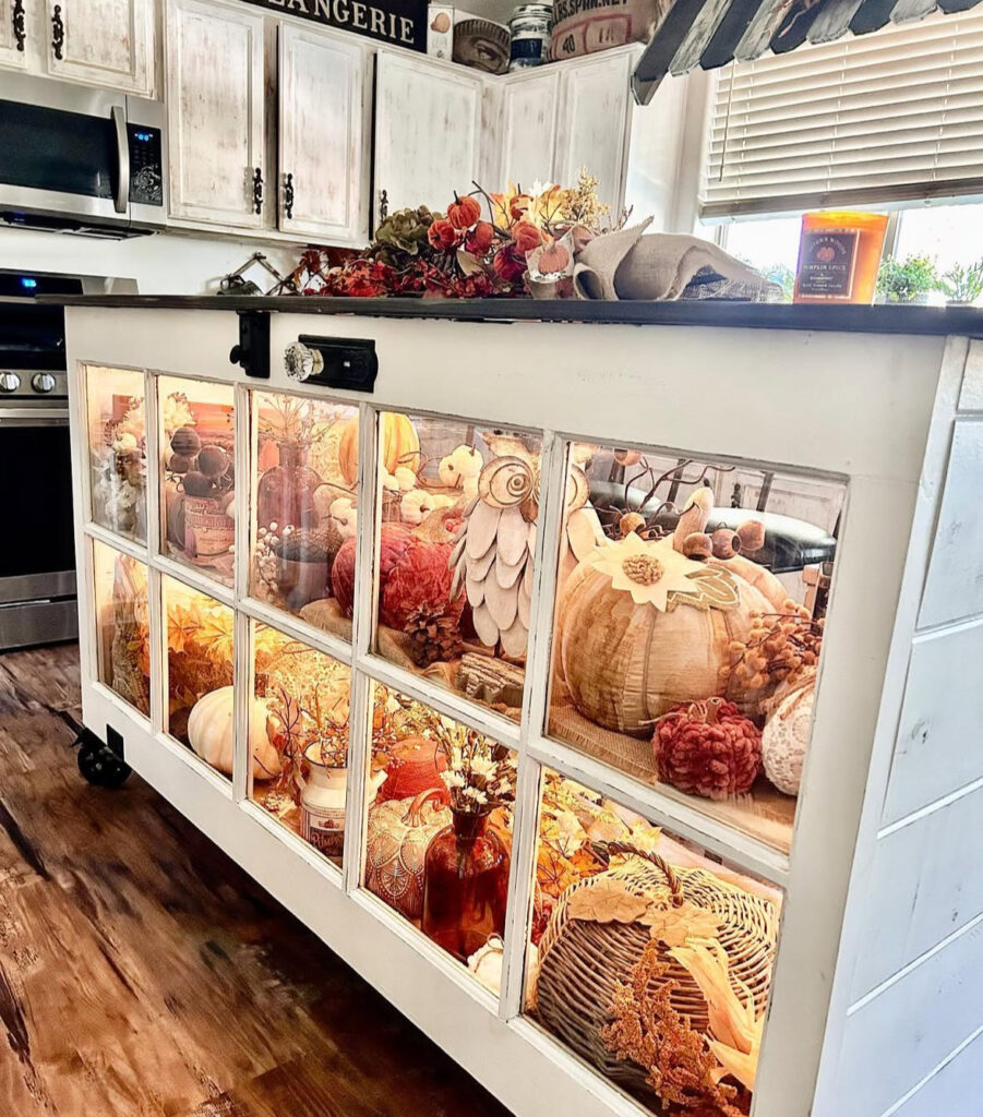 I’m bookmarking this for anyone with a glass-front island or cabinet—treat it like a shadowbox and stuff it with pumpkins, gourds, and a few fairy lights (instant glow, zero guesswork). Then toss a simple garland and a candle on top and you’ve got show-stopping fall kitchen island decor without touching the rest of the room—truly the easiest fall decor for kitchen island I’ve seen in a while.