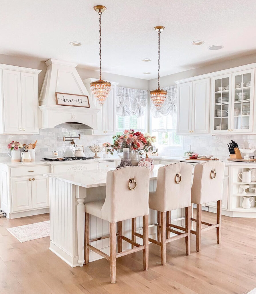 Florals on the island, crystal pendants overhead, and a little “harvest” sign over the hood—it’s giving soft, pretty, and ready for pie. If your style leans elegant, this is how to do fall decor without sacrificing the light, airy vibe.