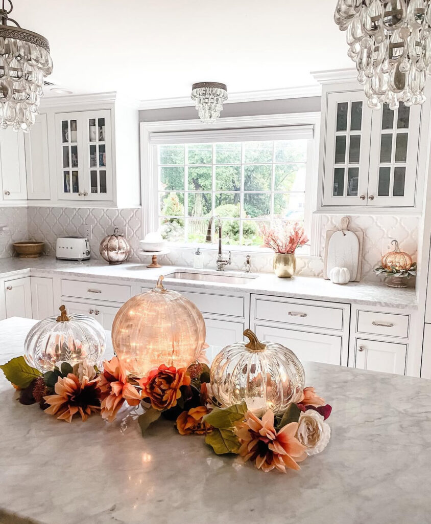 I’m very into the “turn the lights down and let the pumpkins do the work” approach—three glass pumpkins with fairy lights, tucked into a low ring of florals, and suddenly the whole island feels fancy. If your kitchen skews bright and white, this leans glamorous white kitchen fall decor without asking you to change a single thing (my favorite kind of effort).