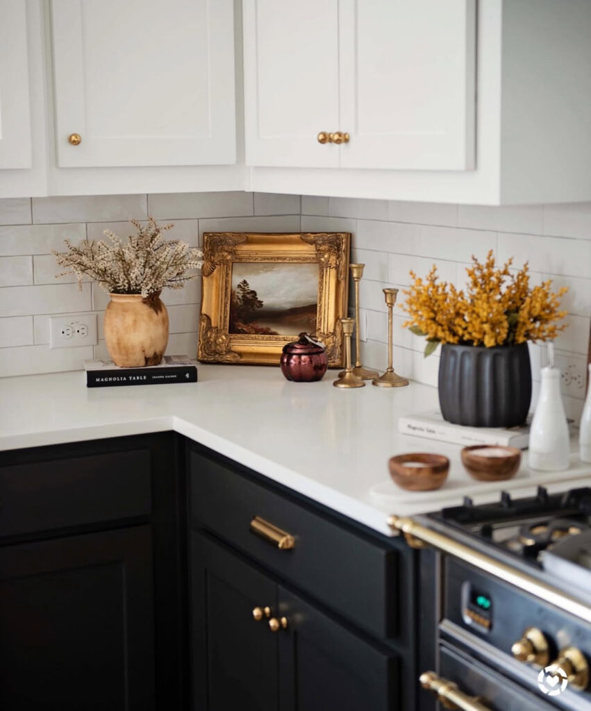 I’d steal this vignette exactly—lean a small landscape, add brass candlesticks, then flank it with two textured vases. It’s a tiny museum moment that doubles as kitchen counter decor, and it warms up black-and-white cabinetry in about five minutes.