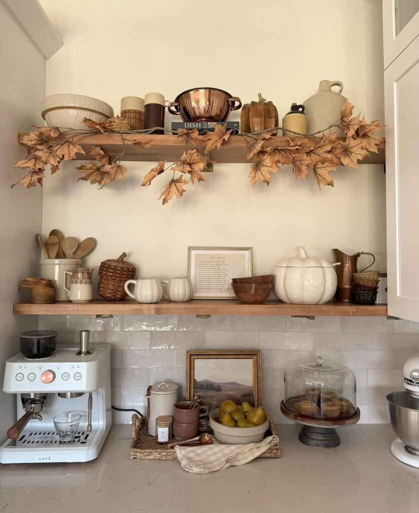 This corner makes me want to swap one summer thing for one autumn thing—leafy garland on the upper shelf, a tiny landscape, and stoneware mugs within reach. If you’re building a coffee spot, let it double as fall kitchen shelf decor so mornings feel a little special.