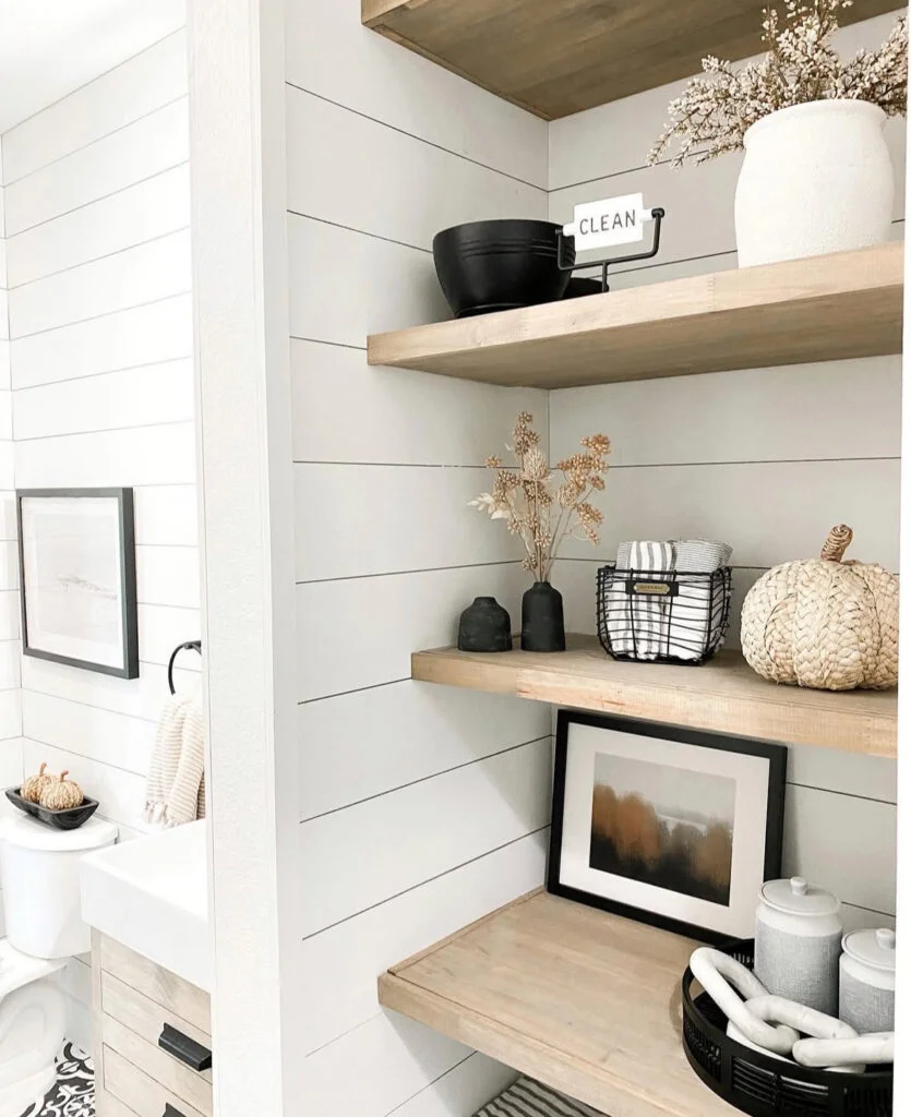Shiplap, woven textures, and a whisper of dried stems make this little bath feel like a spa wearing a sweater. The black accents keep it crisp while the pumpkin keeps it friendly—exactly the blend I want when I’m stealing five quiet minutes.