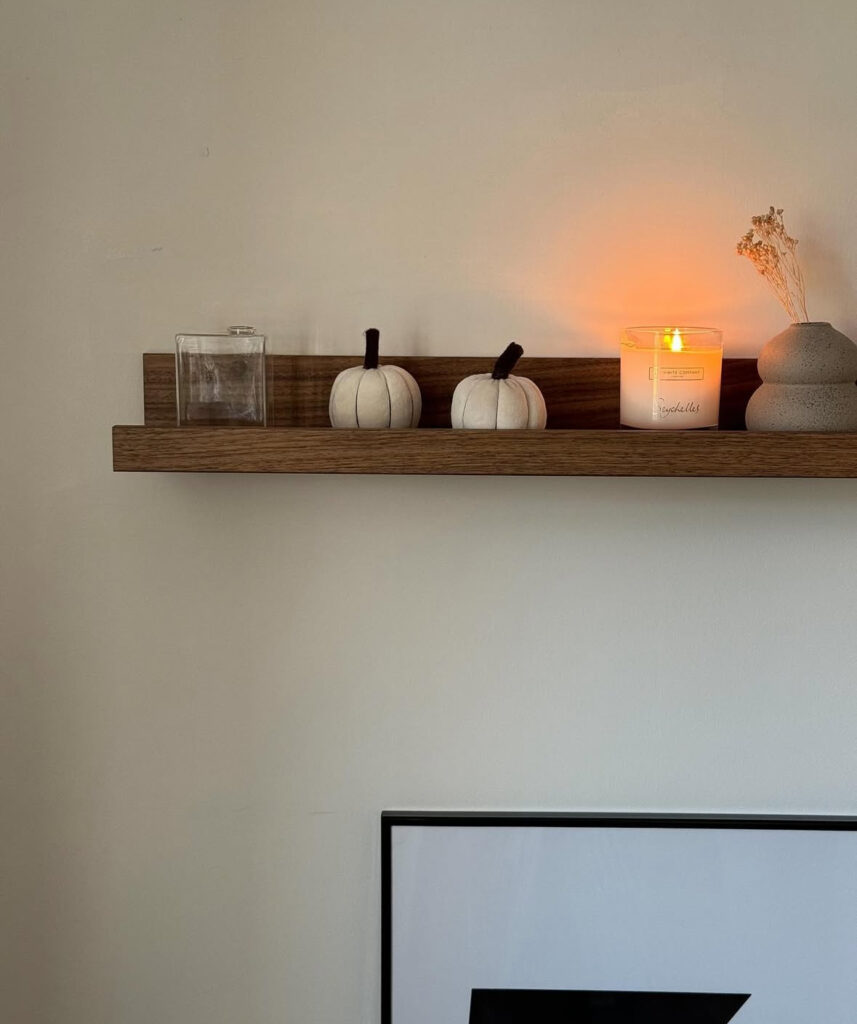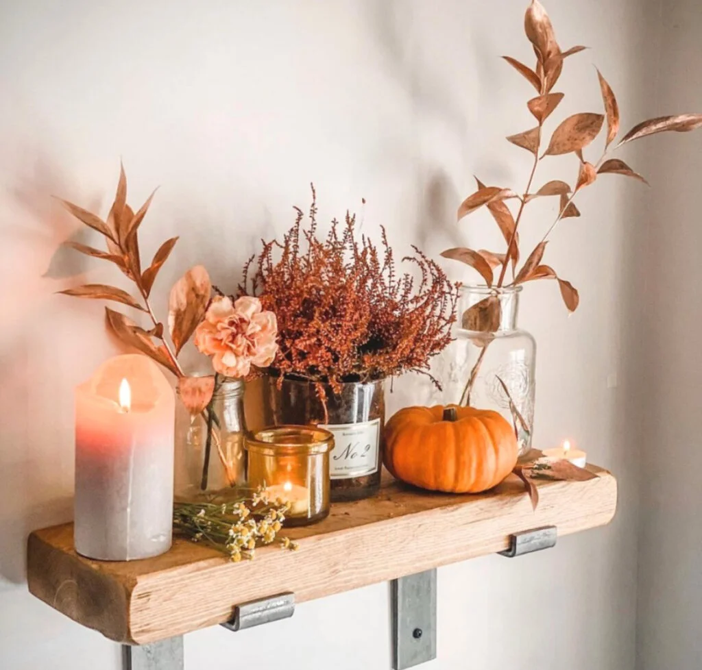 One chunky board, a few jars, a real pumpkin, and candlelight doing what candlelight does—suddenly the hallway becomes a mood. This is the kind of fall floating shelf decor that takes five minutes and makes you look wildly intentional (we love that for us).
