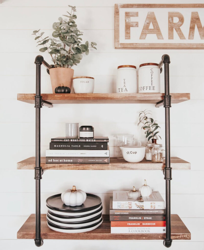 Pipe shelves + cookbooks + mini pumpkins = the kitchen corner I keep wandering back to “for a glass of water” that suspiciously turns into a snack. Canisters and stacks make it practical, while the eucalyptus keeps it from feeling like a carb shrine (no promises).